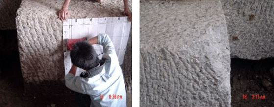 2、对12/C、7/D承台用钢筋探测仪扫描后没有发现钢筋影像,局部破损后也没有发现钢筋迹象。查看原设计图纸证实此处承台只是底部配有钢筋,其余部位未配筋。(检测情况见如下照片)