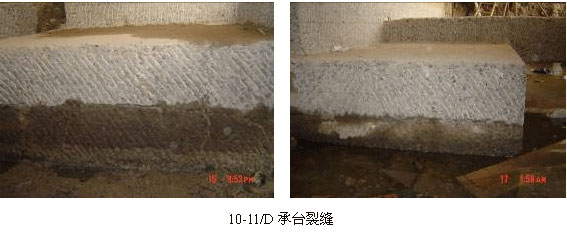当施工缝居于基础桩承台的靠近基础桩一侧时,在基础桩的竖向承载力作用下便发生图片9/E 、10-11/D中表现出的基础桩对基础平台下部的冲切破坏。