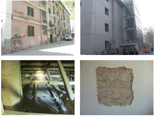 1、工程概况:该建筑物位于三里屯酒吧一条街,为四层砖混结构,屋盖体系为三角形屋架组成的木结构。此建筑物建于上世纪50年代,上世纪80年代,采用外包混凝土柱、圈梁对建筑物进行了抗震加固。此建筑物由于时间较长,无设计、施工资料。