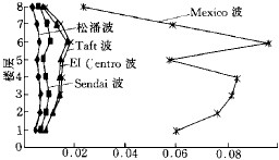 五种地震波计算得到的隔震层反应见表7。图7列出了五种地震波作用下上部结构层间位移峰值。从隔震层及上部的钢筋混凝土楼层反应可知,虽然各地震波的峰值都被调整为350gal, 但各地震波作用下的结构地震反应却不一样。
