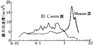 在持时和峰值都相同的情况下,造成如此大的地震反应差别的原因是各地震波频谱的不同。本算例中使用的EICentro波及Mexico波(峰值均被调整为350gal)的绝对加速度反应谱见图8所示, 横坐标为自振周期, 为对数坐标,阻尼比均为0.05。