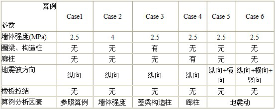 结构的传力路径为: 竖向楼面荷载由预制板传递给进深梁,再由梁传递给纵墙;水平地震作用由两个方向的横墙和纵墙分别抵抗。为了分别研究各因素(包括材料强度、圈梁、构造柱、廊柱、楼板拉结措施、地震波方向等)对结构倒塌模式的影响,本研究设计了多个算例分别进行计算分析,具体见如表1。