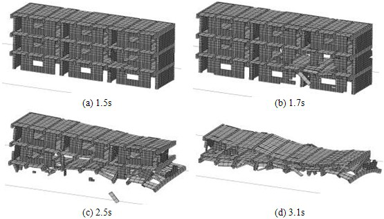 4)墙体垮塌后,导致其他墙体压力增大,引发结构连续倒塌,1.5s后出现大面积垮塌,如图2(d)。
