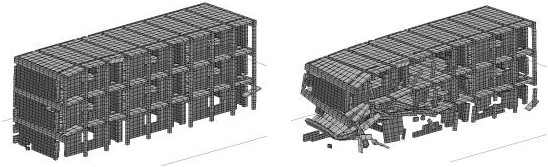 结构倒塌模拟是一个从连续体向非连续体转变的复杂数值过程,要求数值模型既能较好的考虑发生倒塌前结构各项行为,又能反映在部分构件破坏后,结构碎片的刚体位移以及破损块体部分之间的相互接触、碰撞等行为,因此对数值模型提出了很高的要求,国内外学者已进行了大量研究,并在非连续数值模型基础上(离散元法,DDA法等)进行了一些倒塌的模拟。
