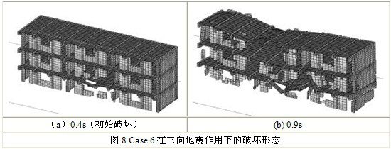 同一次地震,由于建筑离震源距离不同,场地不同,建筑朝向不同,结构受到的地震动作用也不同。Case1、Case5和Case 6输入的地震波形式分别为单向、双向和三向。Case5在0.6s时底部两层右侧教室纵墙首先出现损伤,并导致墙体上方几根梁塌落,如图7。Case 6首次出现破坏的的位置为底层纵墙中部,但后续破坏从三层的纵墙开始,如图8。而Case 1则在0.7s时在二层右侧教室出现损坏。