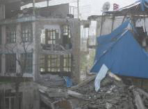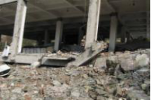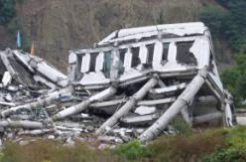 图7为北川青少年活动中心的结构震害。该建筑为8层钢筋混凝土框架结构,框架柱为圆柱,地震后呈整体扭转倒塌,倒塌后柱顶端折断。该建筑距北川职教中心仅100多米,是北川县最高的建筑,且场地条件优于北川职教中心。现场考察显示,下部楼层用粉煤灰砌块做填充墙,且数量不多,而顶部楼层因建筑造型需要,填充墙数量多,重量较大,再加上层数多,发生完全倒塌。