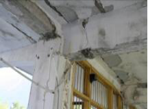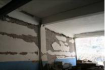 (c) 1层入口东侧填充墙倒塌,框架梁端破坏