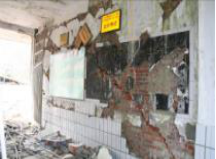 教学楼A、B、C向回字形外侧(跨度大的教室一侧)倒塌(图2a~2d);教学楼F未倒塌(图2e),但震后爆破拆除倒塌;E倒塌状况与C类似(图2f)。教室D、办公楼H、中央楼梯间G和食堂未倒塌(图2g~2k),但损坏较重。教工宿舍P底层倒塌(图2m),震后也爆破拆除倒塌。宿舍L,M,N为砖混结构,未倒塌,但破坏严重(图2n)。学生宿舍J也为砖混结构,底层倒塌,中部1个开间的隔墙倒塌(图2p)。