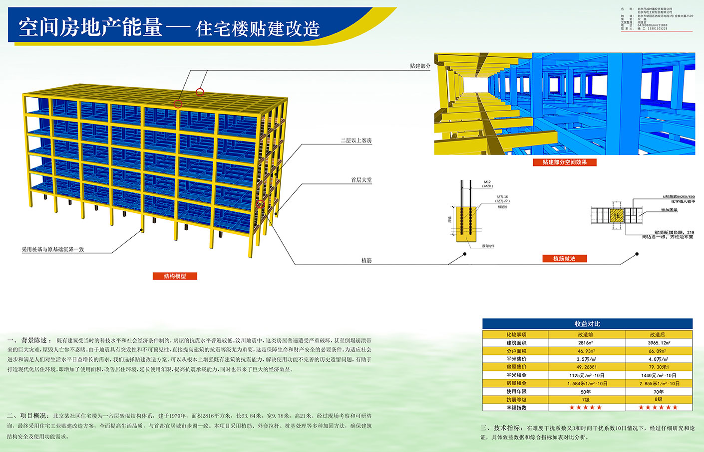 一、背景陈述:既有建筑受当时的科技水平和社会经济条件制约,房屋的抗震水平普遍较低,汶川地震中,这类房屋普遍遭受严重破坏,甚至倒塌崩溃带来巨大灾难,到毁人亡惨不忍睹,由于地震具有突发性和不可预见性,直接提高建筑的抗震等级尤为重要,这是保障生命和财产安全的必要条件,为适应社会进步和满足人们对生活水平日益增长的需求,我们选择贴建改造方案,可以从根本上增强既有建筑的抗震能力,解决使用功能不完善的历史遗留问题,有助于打造现代化居住环境,即增加了使用面积,改善居住环境,延长使用年限,提高抗震承载能力,同时也带来了巨大的经济效益。