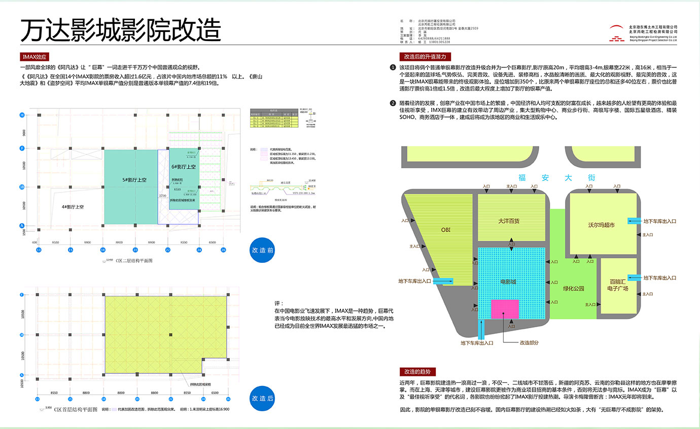 1. 该项目将俩个普通单银幕影厅改造升级合并为一个巨幕影厅,影厅原高20M,平均增值3-4M,  银幕宽22米,高16米,相当于一个竖起来的篮球场气势恢弘,设备先进,装修高档,水晶般清  晰的画质、最大化的观景视野、最完美的音效,这是一块IMAX银幕带来的终极观影体验。建位  增加到350个,比原来两个单银幕影厅建们的总和还多40个左右,票价也比普通影厅票价高1倍  或1.5倍,改造后最大程度上增加了影厅的银幕产值。