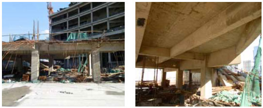 鄂尔多斯市某大厦为地下三层、主楼为近百米双塔楼、裙房为四层商业用房的综合体。结构分为五个单元,两幢高层塔楼和三段裙房。在零米处用抗震缝分割。根据委托方提供的资料及陈述,该工程主体结构在2010年浇筑的砼工程中,存在低标号砼浇筑在高标号部位,为此委托了两家检测单位进行砼强度检测。现场照片如下所示。