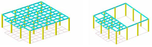 某石油公司办公楼由于改变使用要求,将整栋建筑改为办公用房,为了给刚进大楼的业主等人员一种开阔高远的空间感觉,特要求将裙房一、二层局部框架梁、柱、板去掉,层高均为5.1m,若去掉两层柱子,进门后的层高将达到10.2m,局部裙房改造加固前后如下图模型所示。