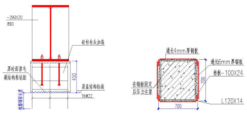 考虑到造价及施工的难易程度,采用框架柱包钢加固方案,工艺成熟且便于施工,如右图所示。角钢L120×14,最外侧用结构胶加通长钢板,角钢与柱子之间空隙不小于8mm;角钢穿过楼板时将切断纵筋与角钢焊接牢靠。角钢下端通过钢板固定于基础底板,上端伸至楼板下皮。在钢板固定后压力注浆,增强结构整体受力特性,防止钢板内侧腐蚀。柱加固遇到梁时,用L63×6 角钢将梁封闭,防止漏浆。